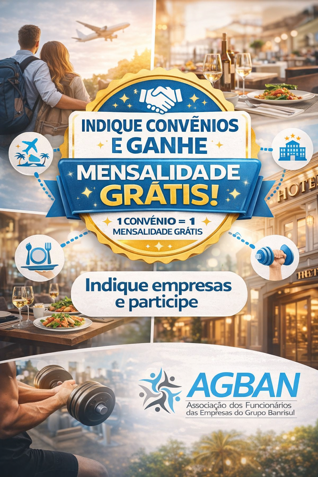 Para estimularmos essa participação, estaremos isentando uma mensalidade por cada convênio que nossos associados indicarem e que forem efetivados. Um associado que conseguir cinco convênios, por exemplo, ficará cinco meses sem pagar a mensalidade da AGBAN. Contamos com a participação de vocês!